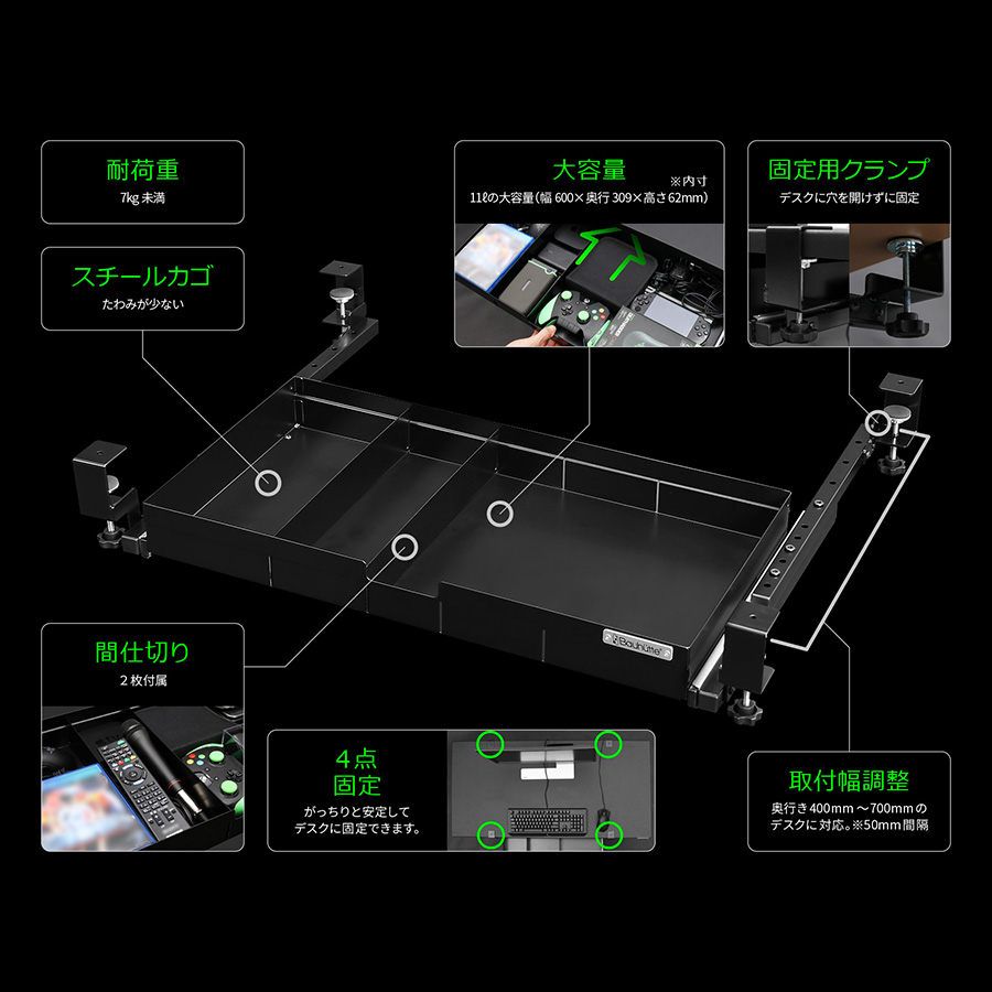 デスクに後付けできるスライド収納です。4箇所をクランプでガッチリと固定し、スムースに引き出せます。