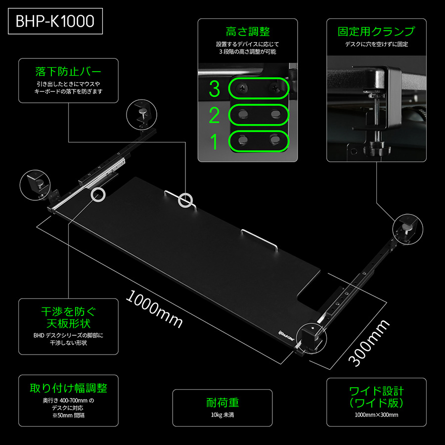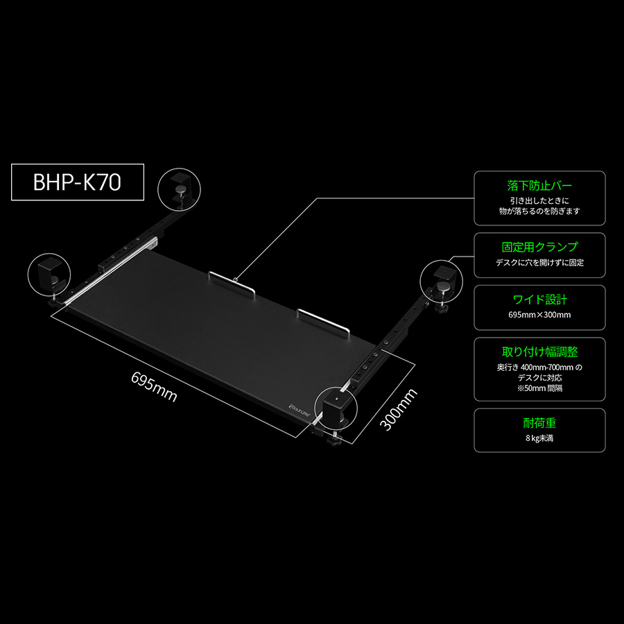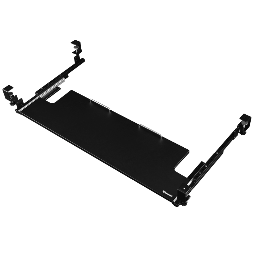 デスクに後付けできる、大型キーボードスライダーです。4箇所をクランプでガッチリと固定し、安定したタイピングを実現します。70/100cm幅の選べる2サイズ展開です。