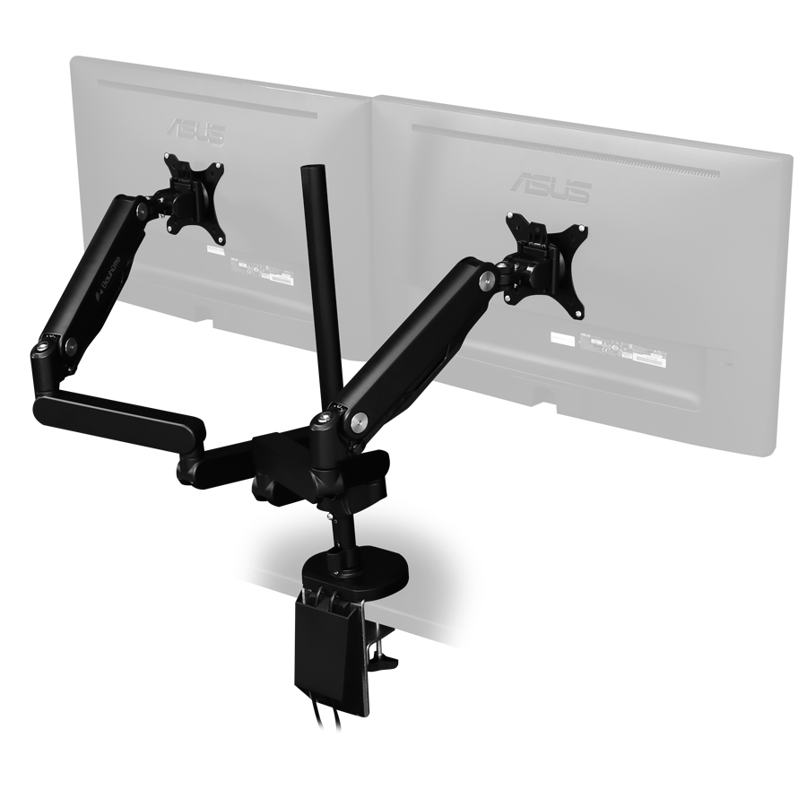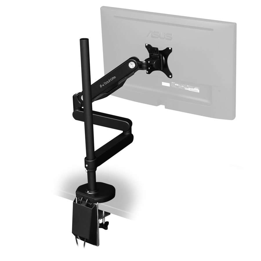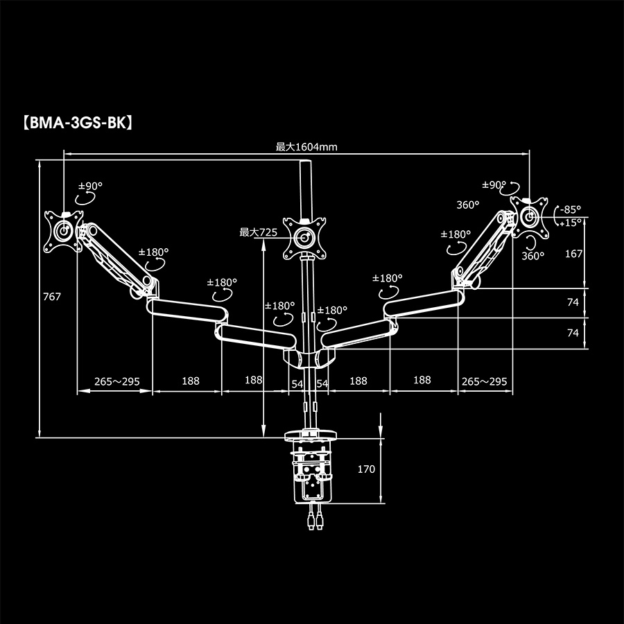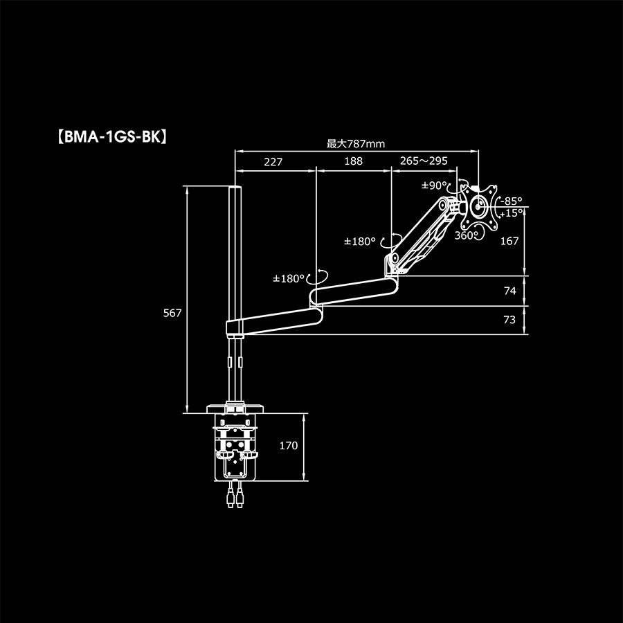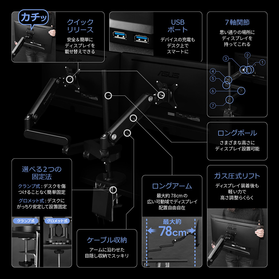 ガス圧式で軽い操作感のモニターアームです。全長約78cmのロングアームを採用しています。シングル/デュアル/トリプルの選べる3タイプ展開。