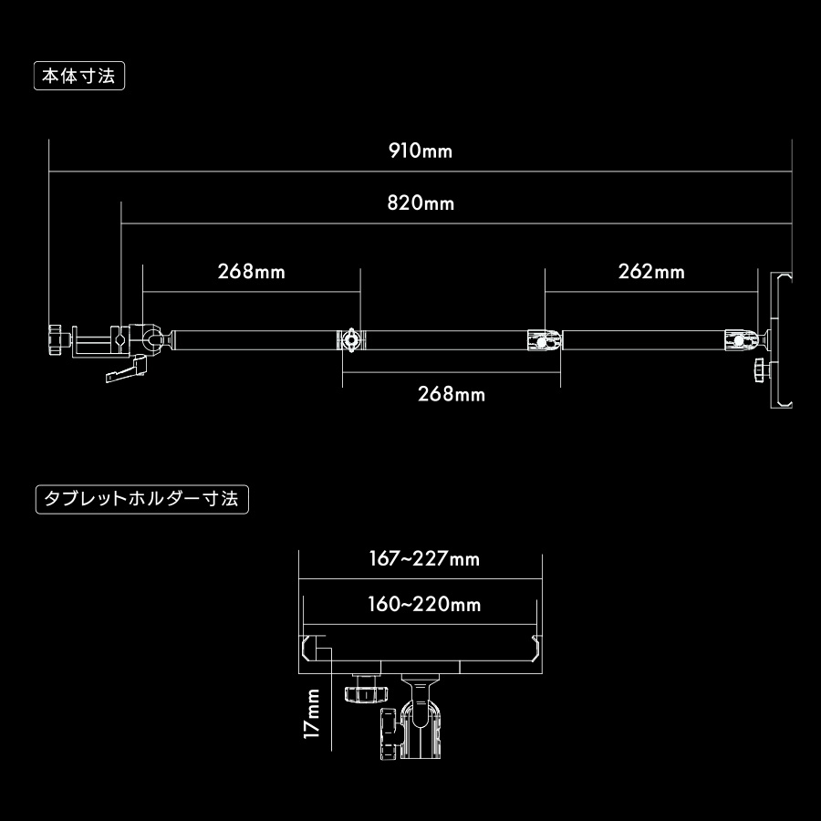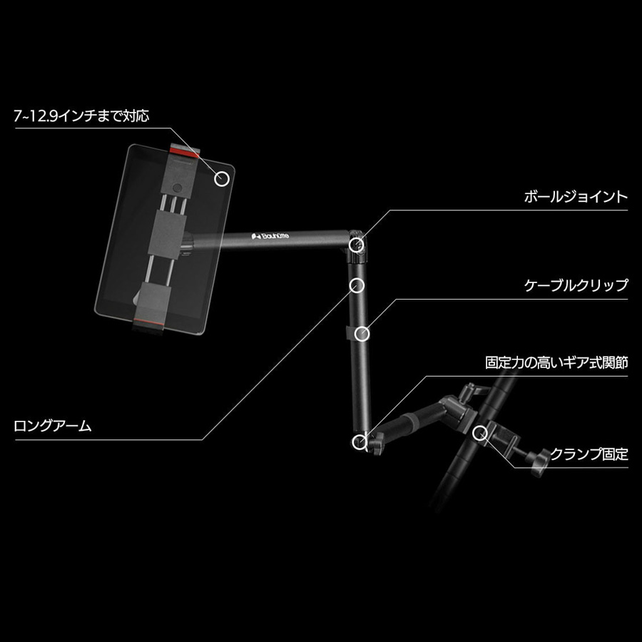 丸パイプ(ポール)にも取付できるタブレットアームです。広い可動域と堅牢な安定性を備え、機材を任意のポジションにガッチリ固定できます。