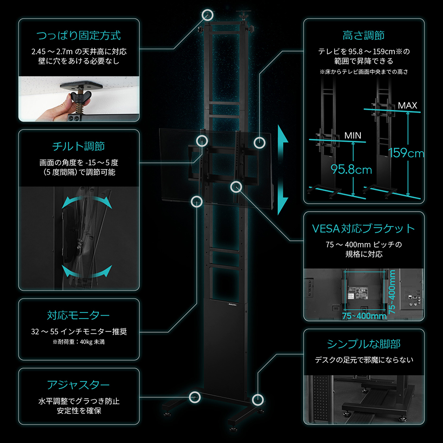 デスクの上にテレビを壁寄せ固定できる、つっぱり固定式のポールスタンドです。チルト&昇降機能を搭載し、画面を見やすい位置に調節できます。