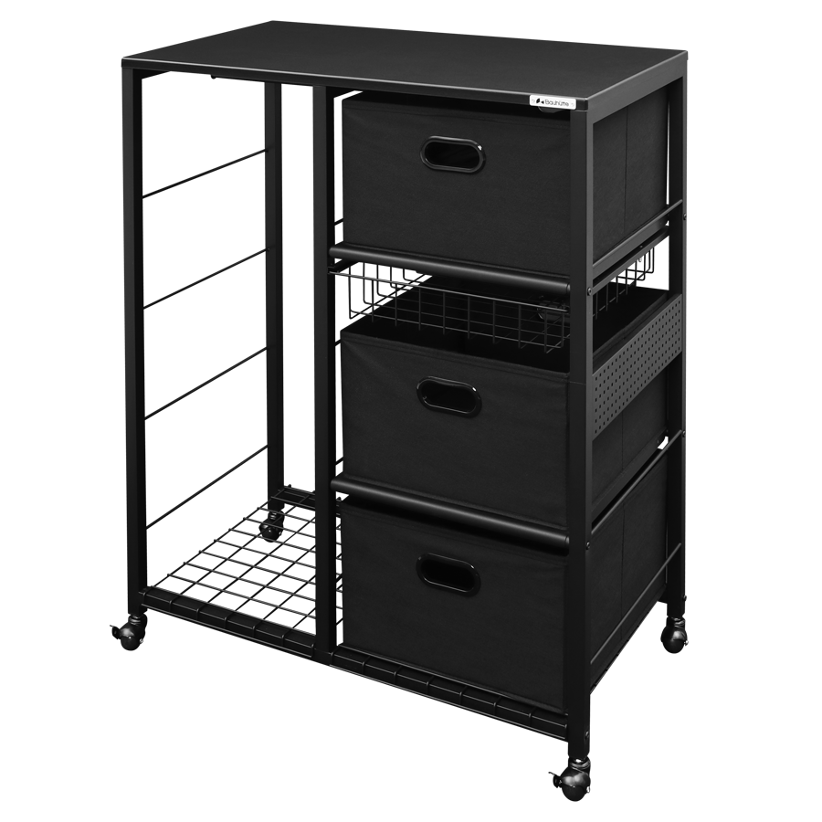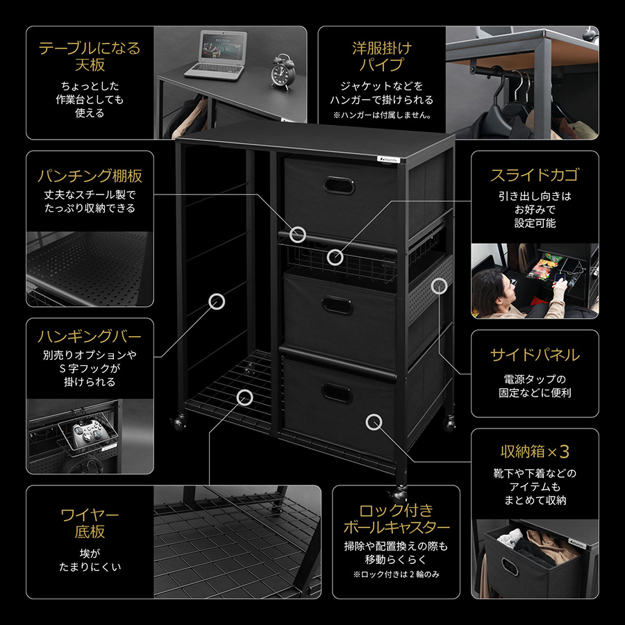 天板付きでテーブルとしても使える、背の低いハンガーラックです。3段の棚も付属し、下着やボトムスもまとめて収納できます。