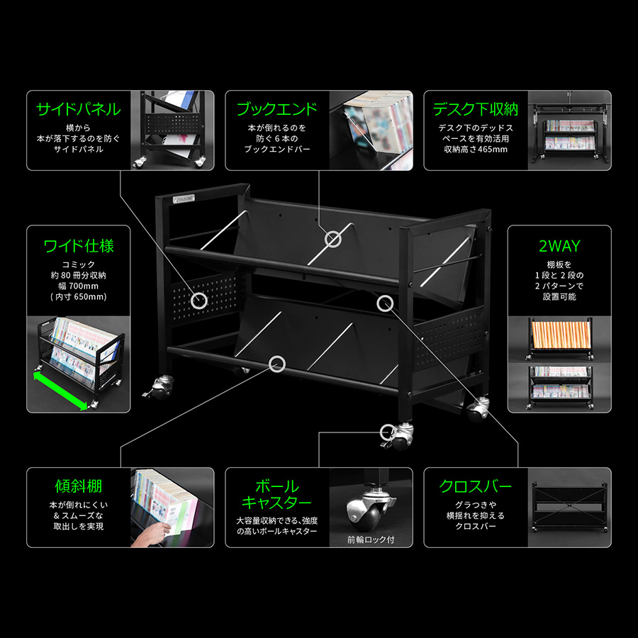 デスク下に設置できる、キャスター付きの収納ワゴンです。サッと取り出しやすい傾斜棚を採用し、コミック約80冊分をたっぷり収納できます。