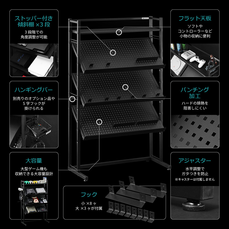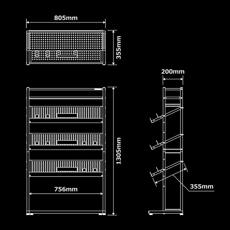 総耐荷重:45kg 天板:15kg 棚板:各10kg フック(大):5kg フック(小):1.5kg