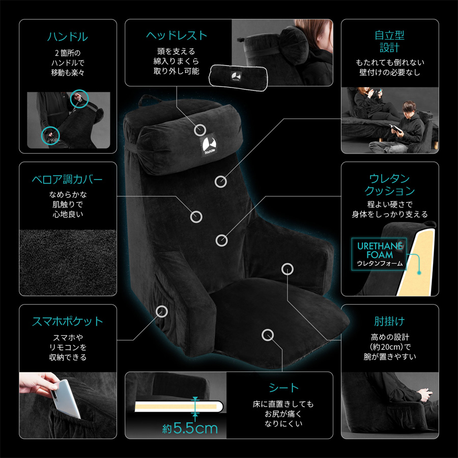 寄りかかっても後ろに倒れない背もたれクッションです。高めの肘掛けが、スマホやゲーム機を操作する腕をしっかり支えます。