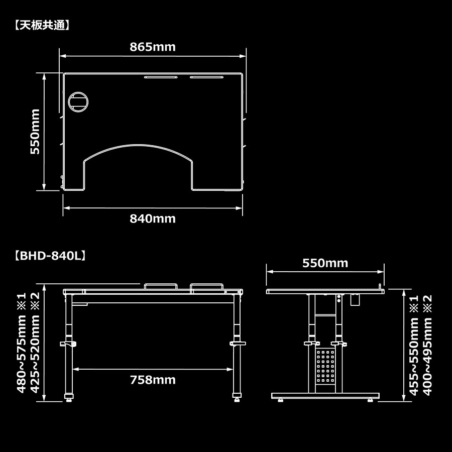 幅 約865mm 奥行き 約550mm 高さ 約480mm(480~575mm)※1 高さ 約425mm(425~520mm)※2 ※1:キャスター使用時 ※2:高さ調節ネジ使用時