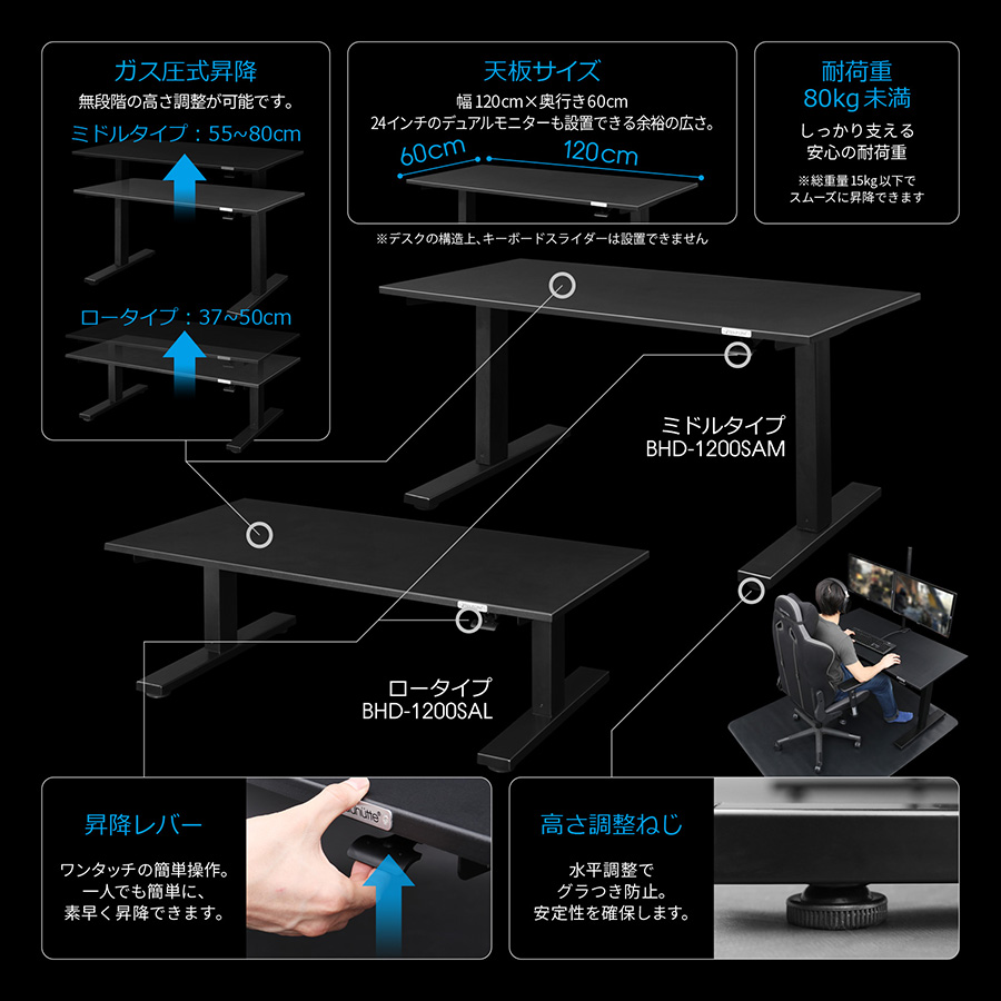 レバー操作で簡単に高さが調節できる、ガス圧式昇降機能を搭載したゲーミングデスクです。ロー/ミドルの2タイプ展開。