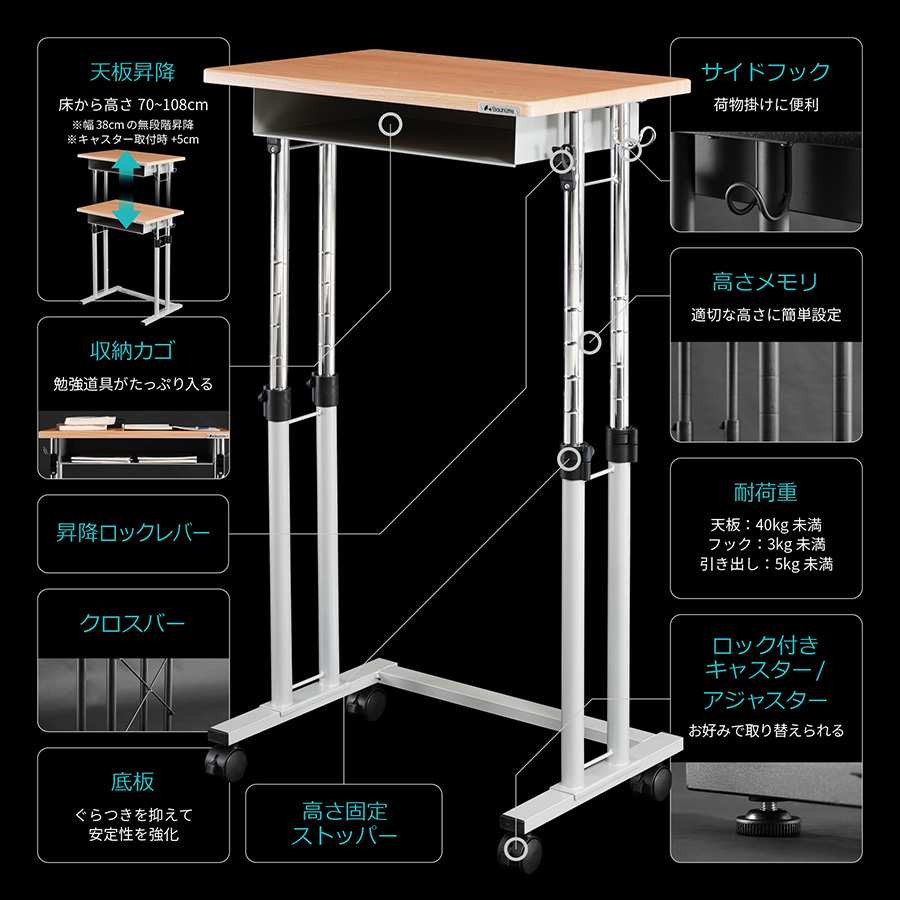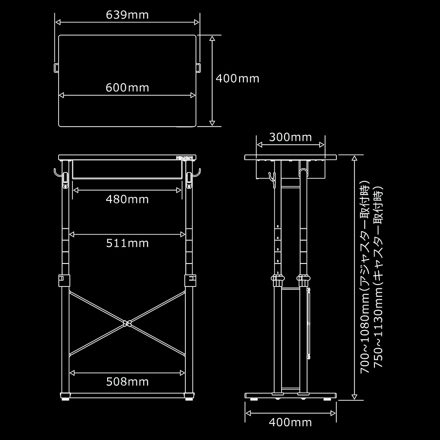 幅 約639mm奥行き 約400mm 高さ 約700mm(700mm~1080mm) ※キャスター取付時+50mm