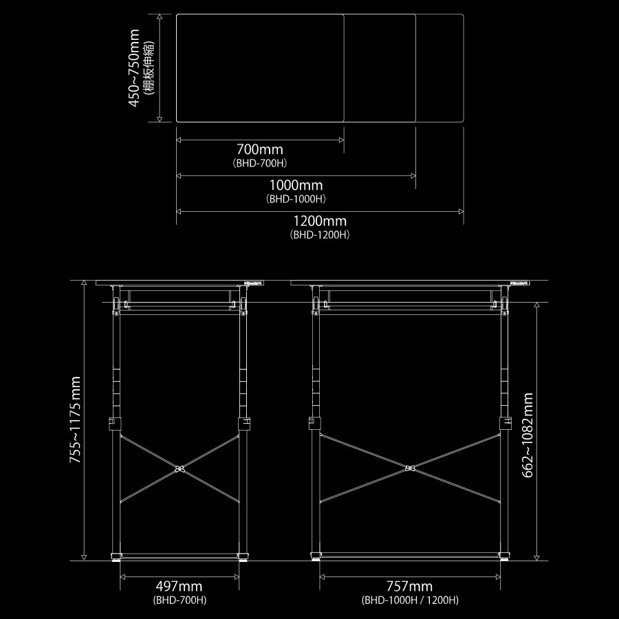 幅 約1200mm奥行き 約450mm(450~725mm) 高さ 約755mm(755mm~1175mm)