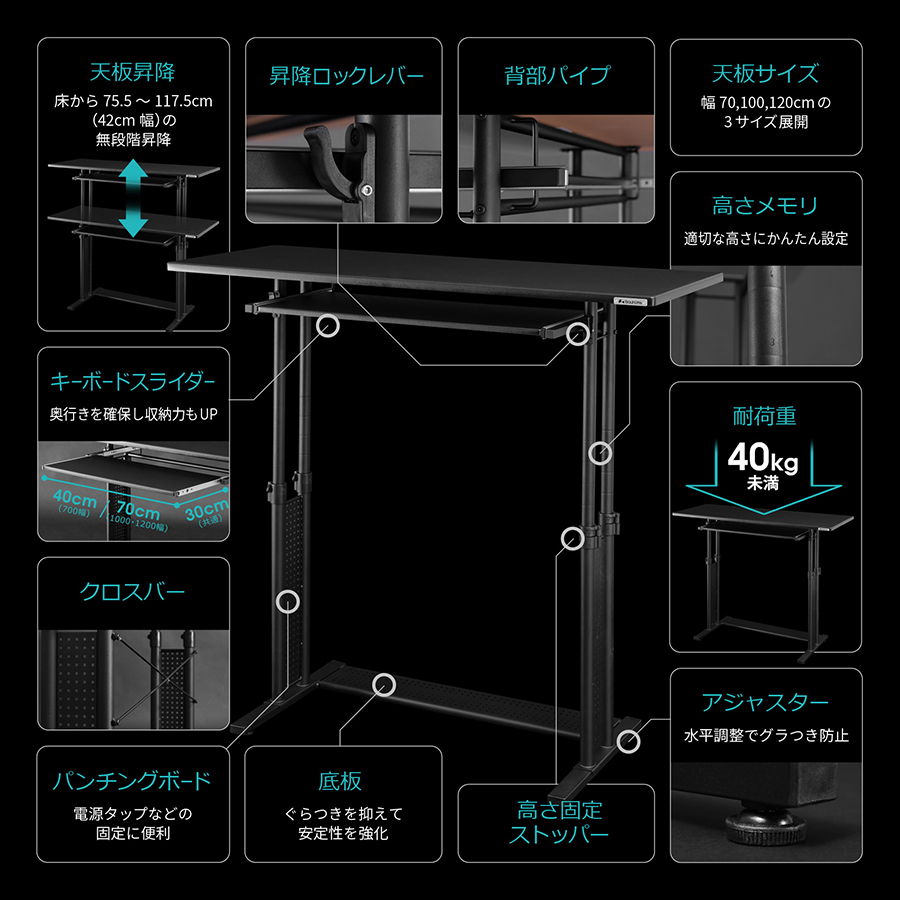 幅 約1000mm奥行き 約450mm(450~725mm) 高さ 約755mm(755mm~1175mm)