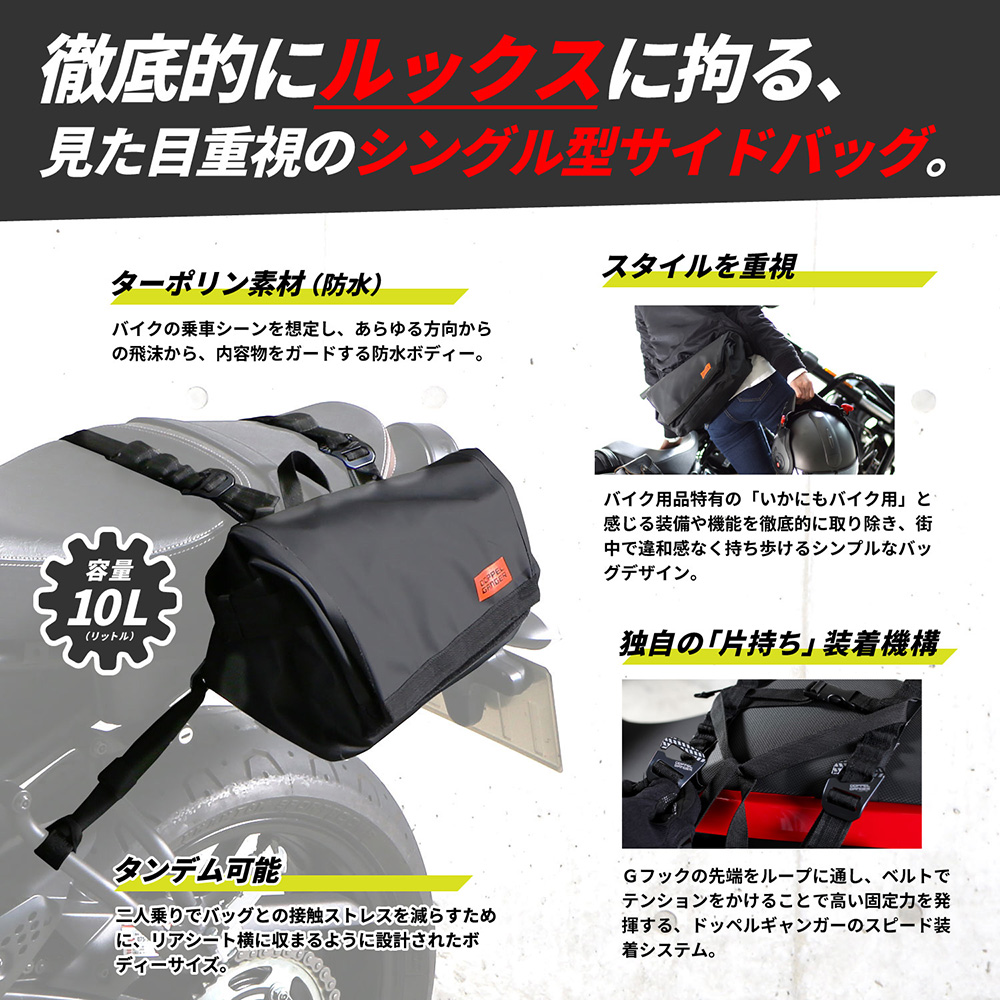 毎日使うのが苦にならないオートバイ用のシングルサイドバッグシリーズ。コンセプトはシンプルです。バイク乗りが求めるのは「普段遣いできる容量で簡単着脱、二人乗りOK、そして防水」。これらの条件を全てクリアし、さらにスポーツバイクをはじめ多くの車種に対応するために、独自の機構を開発しました。平日の通勤から休日のツーリングまでカバーする、バイク乗りのための形を追求した防水サイドバッグです。