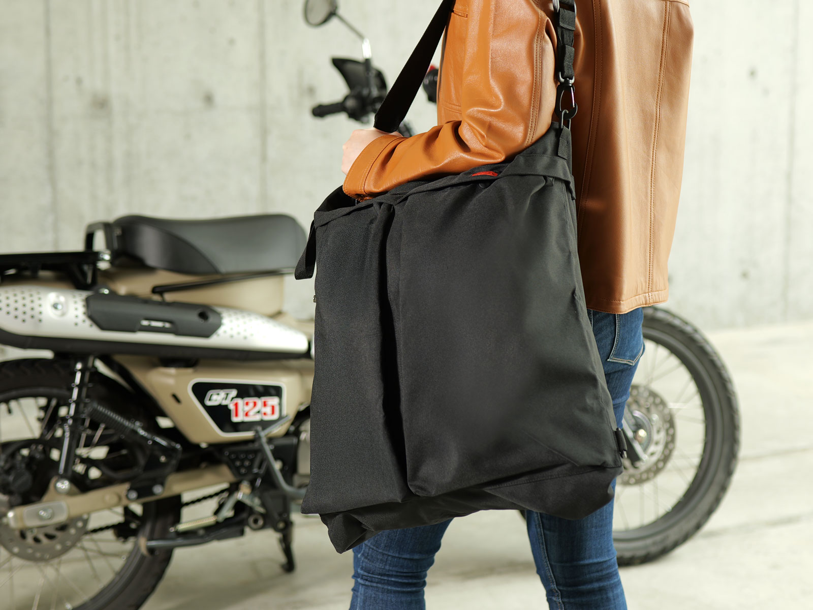 バイク用ヘルメットがすっぽり入る大容量。折りたためるヘルメットトートバッグ。