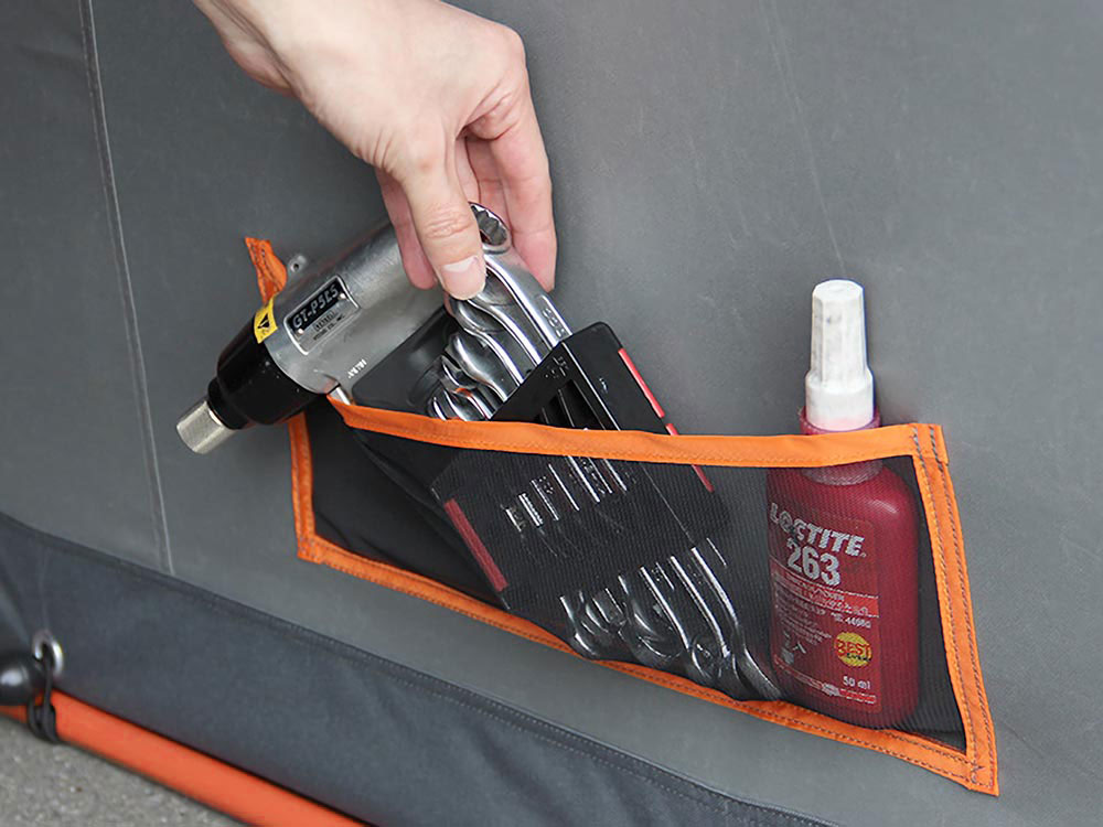 吊り下げ収納袋は任意のパイプに吊り下げることができます。収納袋の前面がメッシュ地になっており、ガレージ庫内でも中身の確認がしやすいように配慮してあります。