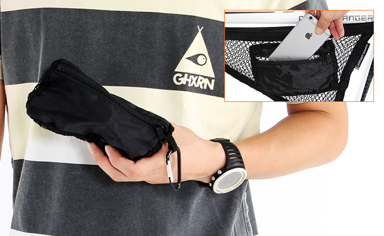 バイシクルハンモックは自転車乗車時の手ぶらをサポートする以外に、出先での手ぶらスタイルにも配慮しています。ハンモックの小物入れは折りたたみ時の収納袋になるパッカブルデザイン。小物入れ内部のカラビナはパッカブル時にフックとして利用が出来、パンツのベルトループなどに引っ掛ければ、出先で普段の手ぶらスタイルを真っ当する事が出来ます。