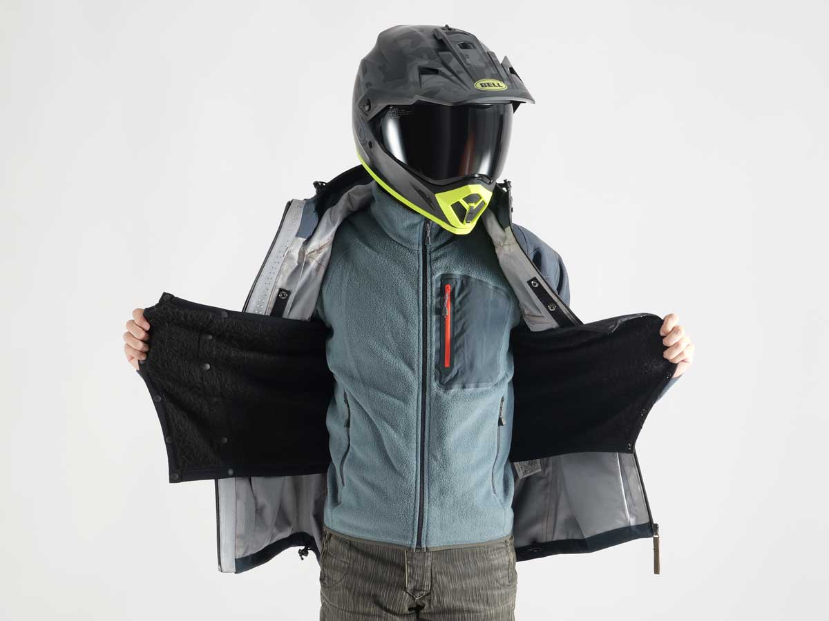ループと起毛の2つの空気層を持つもちはだによって実現した厚い断熱層は、外気を遮断し、体温を外に逃さない事で高い保温性を実現します。冷たい走行風からバイク乗りの体幹温度を守ります。