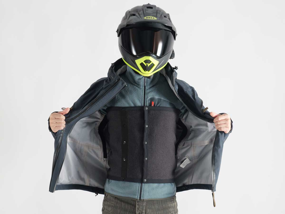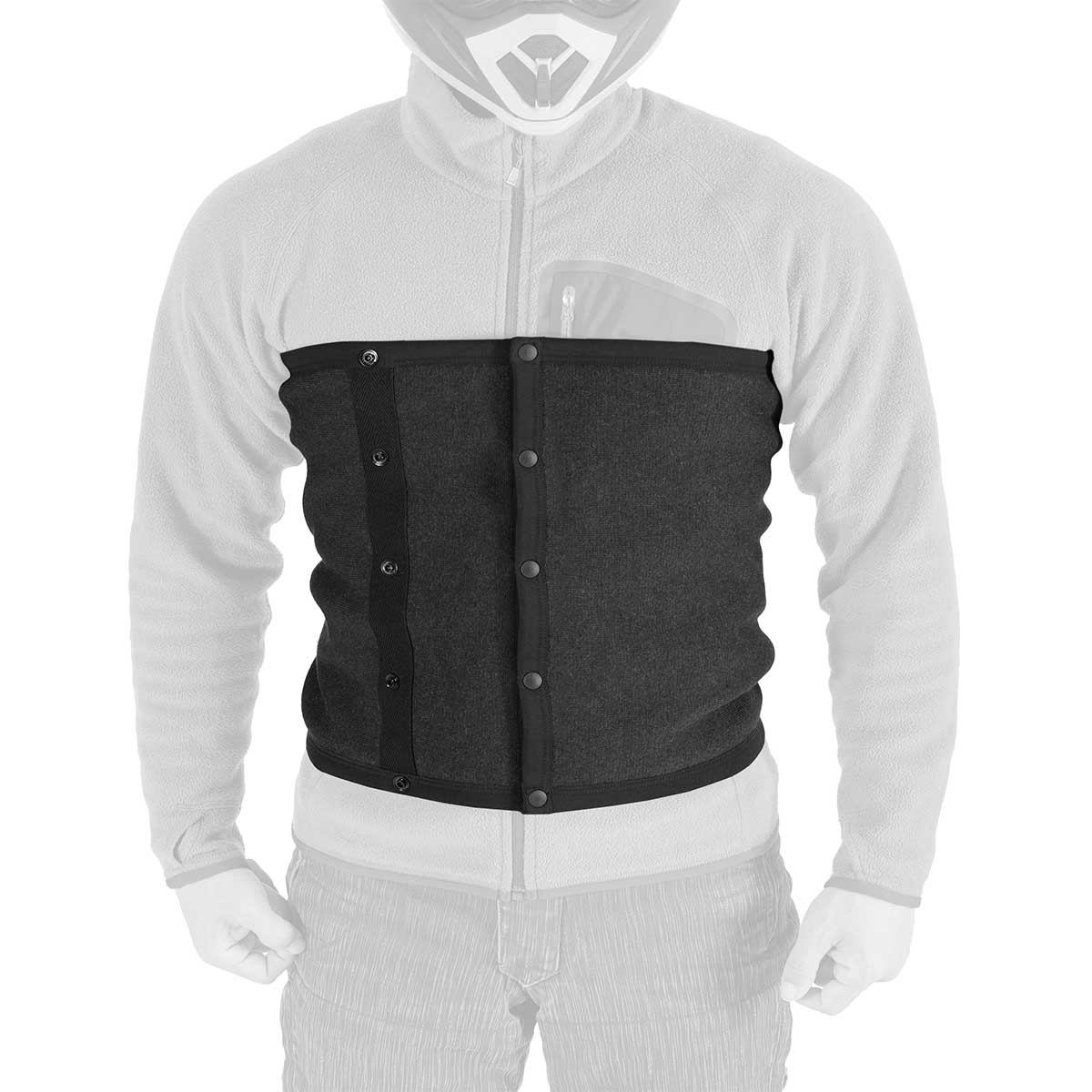 ベスト風のすっきりとしたデザインの前開きスナップボタンが、ジャケットを着たままでも当該製品の着脱を可能としました。長めの丈と、2つの空気層で断熱することで圧倒的な暖かさを生み出す「もちはだ」ブランドとコラボしたバイク乗りのための腹巻きです。